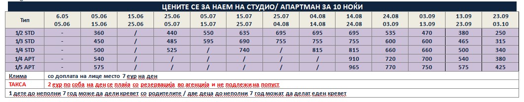 Такса за престој, во висина од 2 еврa по сместувачка единица на ден се плаќа во агенција со резервација и не подлежи на попусти!