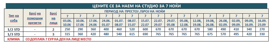 • На дополнителните услуги (доплата за клима, полупансион и сл.), наведени во ценовникот, не се пресметуваат попусти.