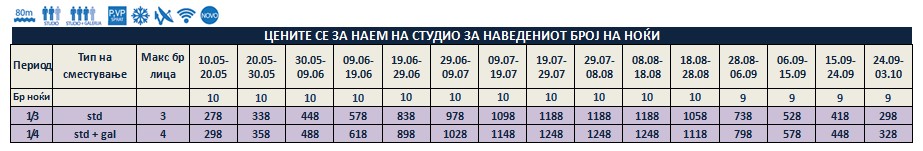 – за комплетна уплата со резервација за престој во термините со почеток од 20.05. – 12.06. и 28.08. – 24.09., се одобрува попуст од 50% на цената на наемот за избраното сместување