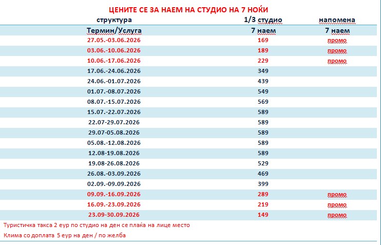 * Во студио е дозволено сместување на лица согласно предвидениот капацитет (број на кревети)