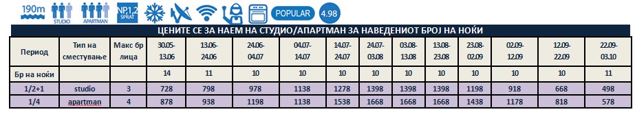 – за комплетна уплата со резервација за престој во термините со почеток од 20.05. – 12.06. и 28.08. – 24.09., се одобрува попуст од 50% на цената на наемот за избраното сместување