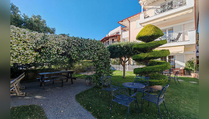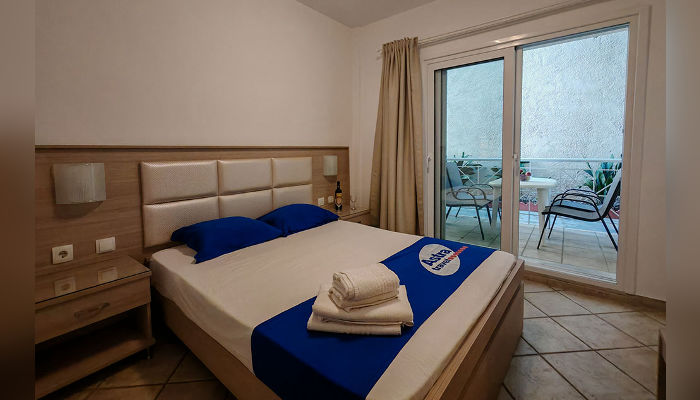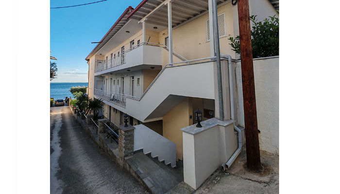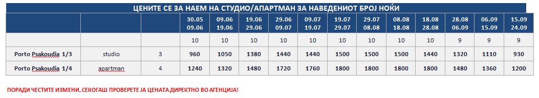 PORTO PSAKOUDIA – Се наоѓа на самата плажа. Главните предности на оваа куќа се преубавиот двор со многу зеленило и скоро приватна плажа со лежалки и чадори кои се (во ограничен број) на располагање на гостите без надокнада. Студијата и апартманите се на приземје и на втор кат. Сите имаат сателитска TV, бежичен интернет, за чија брзина агенцијата не може да гарантира и клима уред, чие користење е вклучено во цената. Сите сместувачки единици имаат мал фрижидер, решо, комарници, по еден пешкир по лице и сите имаат балкони кои се со поглед кон ѕидот од соседната куќа.
