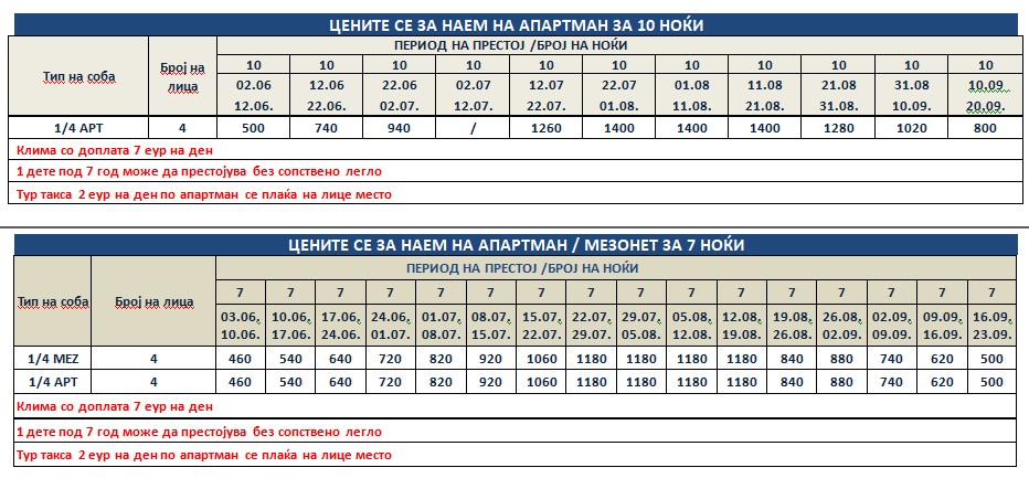 Такса за престој, во висина од 2 еврa по сместувачка единица на ден се плаќа на лице место пред влегување во објектот. Подлежи на измени!