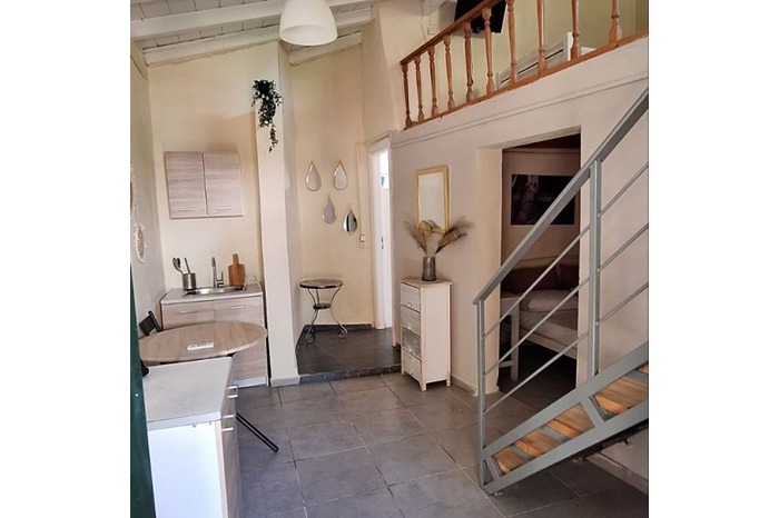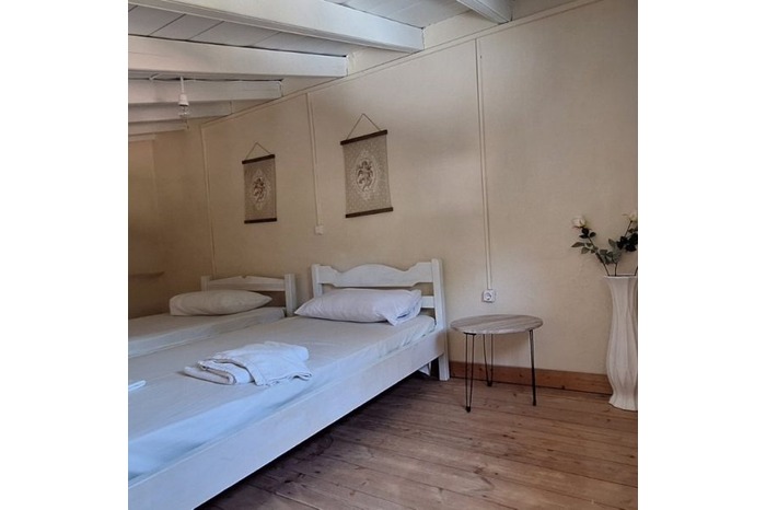 Бр 2. МЕЗОНЕТ – 1/4 Мезонетот – галерија. На долното ниво е мини кујна, тоалет и еден брачен кревет, а со внатрешни скали се искачува на дел каде што има два единечни кревети. Во мезонетот може да престојуваат 4 лица, но се препорачува да бидат деца, тинејџери, бидејќи тој ден е понизок.