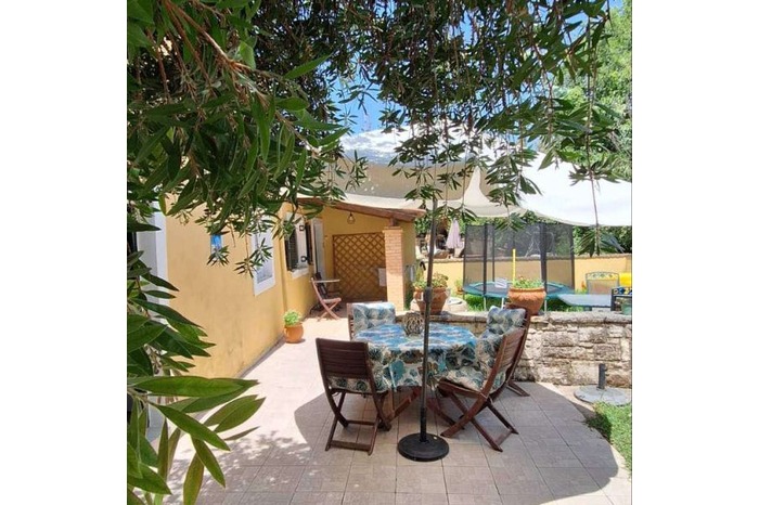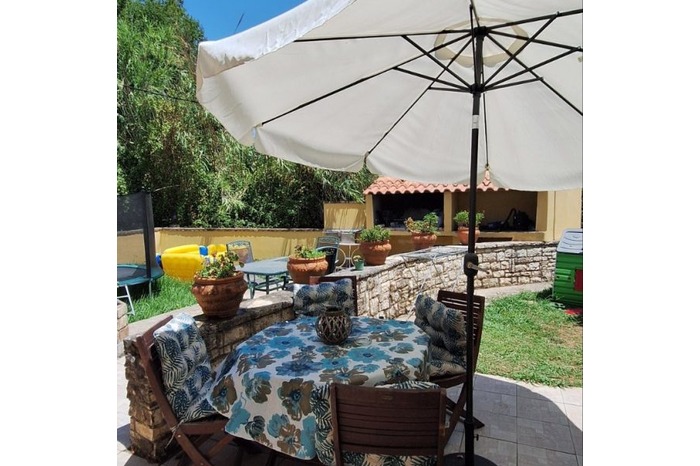 Мала куќичка веднаш до основната зграда, каде што има скара, детски играчки и мало заедничко дворче за два апартмани.
