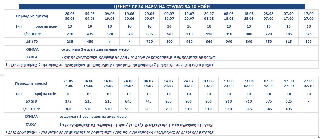 Такса за престој, во висина од 2 еврa по сместувачка единица на ден се плаќа во агенција со резервација и не подлежи на попусти!