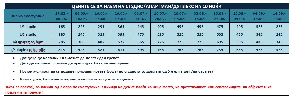 Такса за престој, во висина од 2 еврa по сместувачка единица на ден се плаќа на лице место, на претставникот или сопствениците на објектот и не подлежи на попусти!
