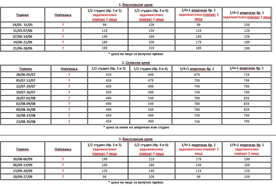 • ЦЕНИТЕ ВО ТАБЕЛА БР.2 – СЕЗОНСКИ СЕ ДАДЕНИ ЗА НАЕМ НА АПАРТМАН/ДУПЛЕКС АПАРТМАН ЗА 7 НОЌЕВАЊА, според бројот на кревети во секоја соба, без вклучен превоз, а истиот се доплаќа: