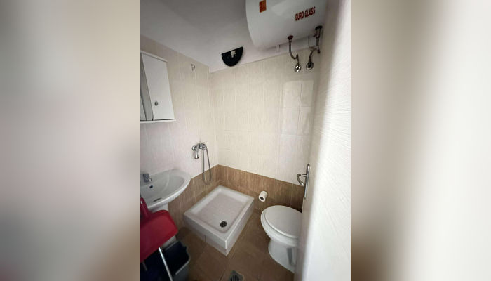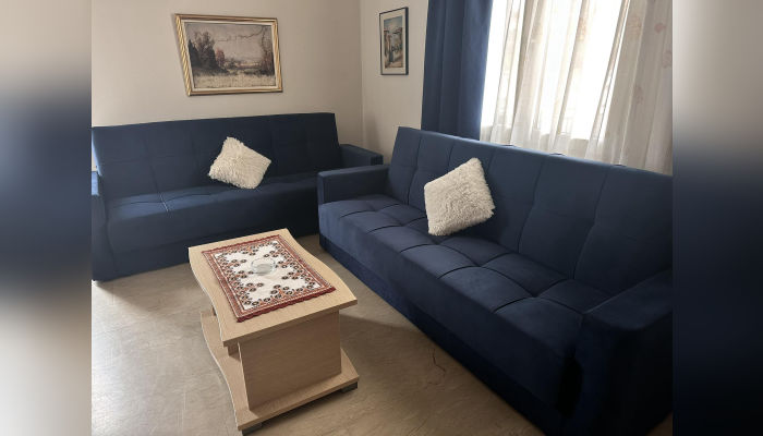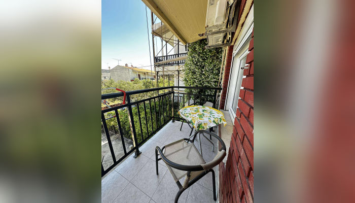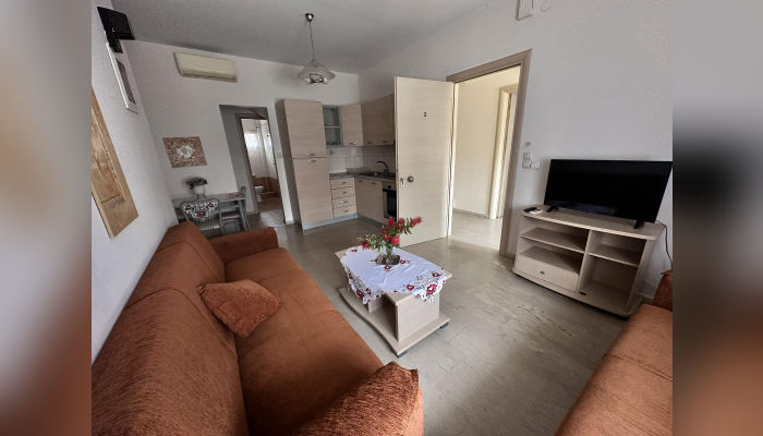 Апартман бр. 1 (1/4+2) – 4 лица + 2  –  високо приземје. Простран апартман со брачен кревет во спална соба, две софи на извлекување во дневна соба споена со кујна. Кујната е комплетно опремена со голем електричен шпорет со рерна, голем фрижидер, маса со столови, клима уред и телевизор. Апартманот има сопствен тоалет со туш. Од кујна се излегува на тераса со страничен поглед море и истата е опремена со маса и столови.