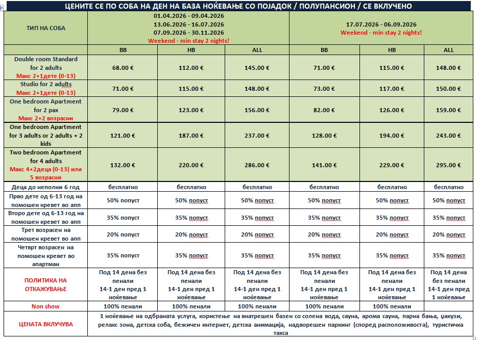 *За валидна резервација е потребна уплата од мин 50% од вкупната сума, во денарска противвредност по курс 1 еур=62 ден. Останатиот дел се доплаќа најдоцна 21 ден пред поаѓање.