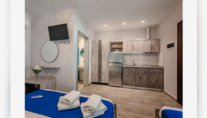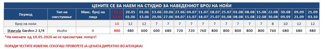 STAVRULA GARDEN 2 – Куќата се наоѓа веднаш позади куќата Stavrula garden 1, на околу 360m од море. Во понуда се студија за 4 лица, кои се наоѓаат на високо приземје. Пред куќата е тревнат двор со скара. Студијата имаат опремена кујна, пешкири, комарници, ТВ, бежичен интернет, за чија брзина агенцијата не може да гарантира, како и клима уред чие користење е вклучено во цената. Пред куќата има паркинг за гостите.
