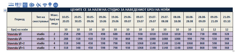– за комплетна уплата со резервација за престој во термините со почеток од 20.05. – 12.06. и 28.08. – 24.09., се одобрува попуст од 50% на цената на наемот за избраното сместување