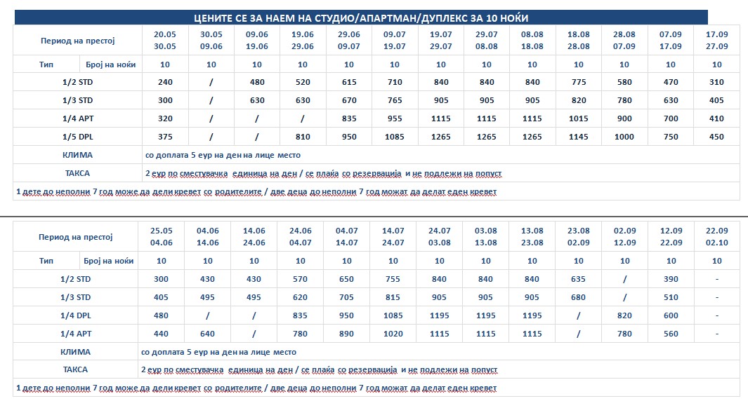 Такса за престој, во висина од 2 еврa по сместувачка единица на ден се плаќа во агенција со резервација и не подлежи на попусти!