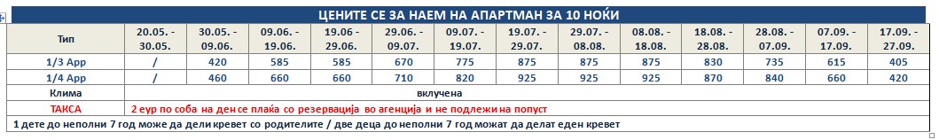 Такса за престој, во висина од 2 еврa по сместувачка единица на ден се плаќа во агенција со резервација и не подлежи на попусти!