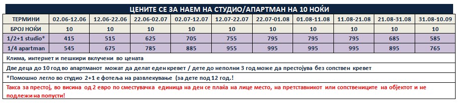 Такса за престој, во висина од 2 еврa по сместувачка единица на ден се плаќа на лице место, на претставникот или сопствениците на објектот и не подлежи на попусти!