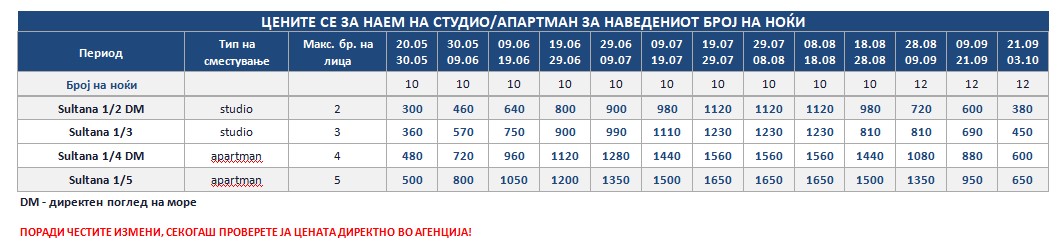 SULTANA – Се наоѓа на само 50 м од градската плажа, во најбараниот дел на Неос Мармарас, веднаш покрај фудбалското игралиште. Во понуда се студија за 2 до 3 лица, како и апартмани за 4 до 5 лица. Сите имаат комарници, ТВ, сигнал за користење бежичен интернет, чија брзина и проток агенцијата не може да ја гарантира. Користењето на клима уредот е вклучено во цената. Има пешкири.