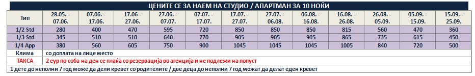 Такса за престој, во висина од 2 евро по сместувачка единица на ден се плаќа во агенција со резервација и не подлежи на попусти!