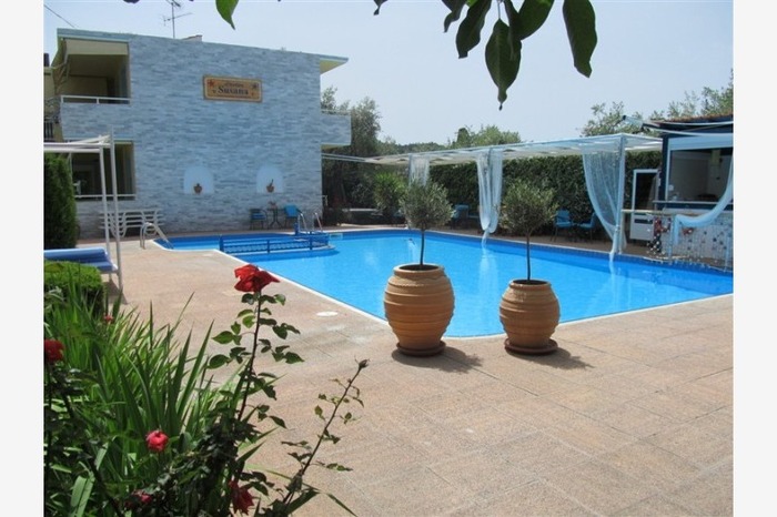 Suzana 2 се наоѓа на излезот од Потос, на околу 100 m oд плажата и 500 m од центарот на местото. Во убаво уредениот двор има базен со лежалки и чадори, туш, игралиште за деца и скара, а во објектот има и машина за перење алишта, која гостите може да ја користат бесплатно. Комплексот има 2 објекти, поголемиот, централно покрај базенот е Suzana 1, додека вториот објект Suzana 2 е поблиску до влезот и има студија и апартмани на 2. кат и на приземје. Сите имаат основно опремена кујна со фрижидер, решо, садови и прибор според бројот на креветите, купатило, тераса, TV, фен, клима уред, чие користење се доплаќа на лице место, интернет, за чија брзина агенцијата не може да гарантира. Чистење и промена на постелнината е еднаш во текот на престојот.