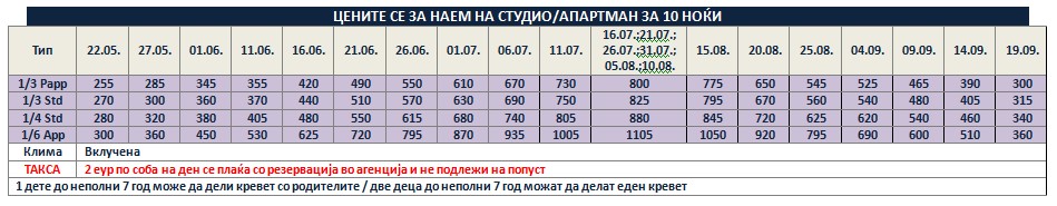Такса за престој, во висина од 2 еврa по сместувачка единица на ден се плаќа во агенција со резервација и не подлежи на попусти!