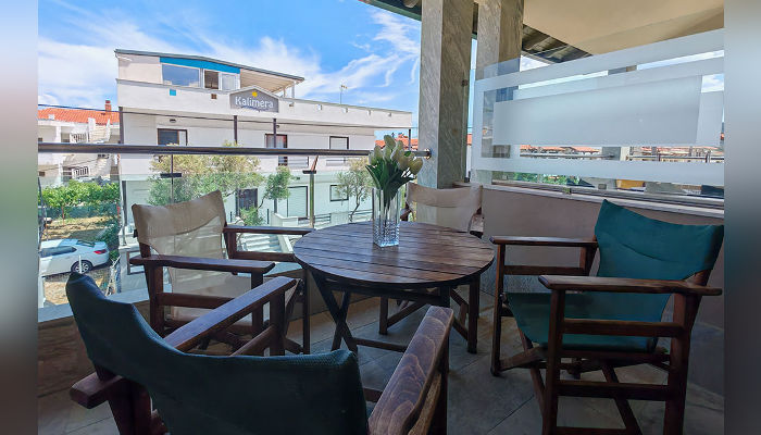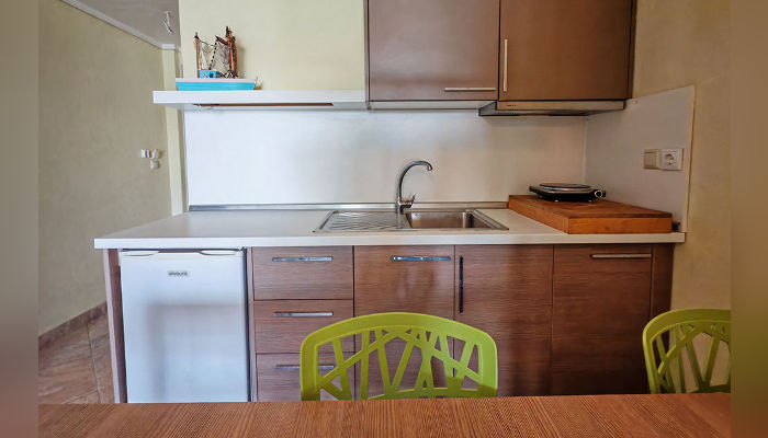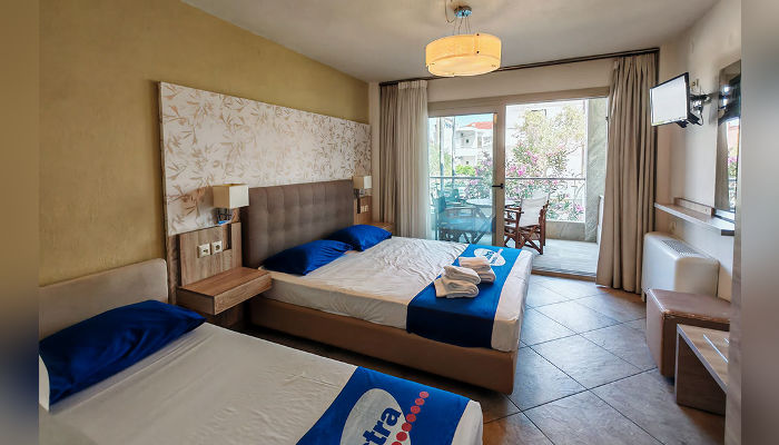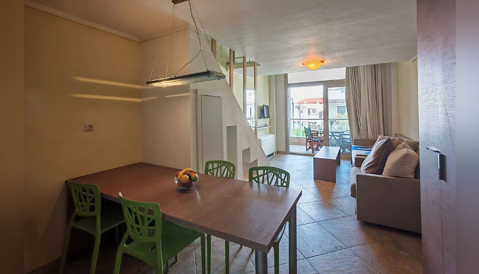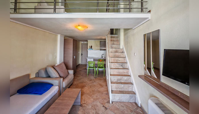 TALIZETI – Модерно уредена и луксузно опремена куќа, се наоѓа во новиот дел на Сарти, на само 30 м од плажата. Апартманот за 2+2 лица се наоѓа на приземје. Супериор студијата се на првиот кат, а посебните супериор студија со галерии за 6 лица се наоѓаат на вториот кат. Студијата имаат француски и единечен кревет во една просторија, а уште еден со димензии 200х77 цм во кујнскиот дел, позади ѕидот. Опремени се со мали фрижидери, решо, пешкири, туш кабини, комарници, средно големи тераси со поглед на улица. Помеѓу двете студија постои врата која е заклучена и се отвора единствено ако двете студија ги изнајми едно поголемо семејство. Апартманот се наоѓа во ниско приземје, има француски кревет во спална соба и кревет на расклопување во кујнскиот дел, мал фрижидер, решо, туш кабина, пешкири, комарници, голема тераса. Супериор студијата со галерија за 4+2 лица имаат двосед и фотеља на расклопување во долното ниво и на галерија француски кревет и фотеља на расклопувење. Опремени се со мал фрижидер, решо, туш кабини, пешкири, комарници, средно големи тераси. Сите имаат SAT TV, бежичен интернет, за чија брзина агенцијата не може да гарантира и клима уред чие користење е вклучено во цената. Организирано е чистење на студијата и апартманите еднаш за време на престојот.