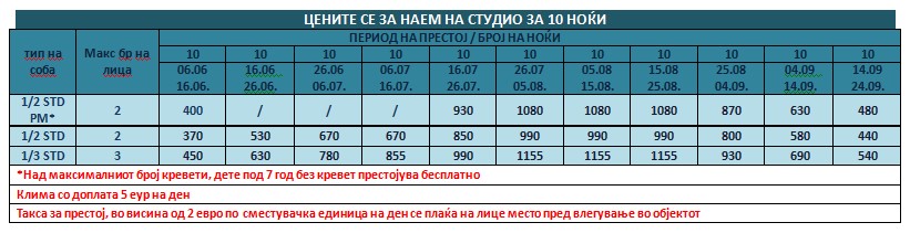 Такса за престој, во висина од 2 еврa по сместувачка единица на ден се плаќа на лице место пред влегување во објектот. Подлежи на измени!