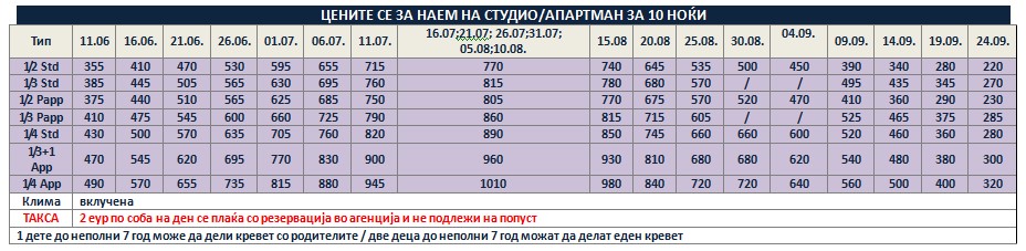 Такса за престој, во висина од 2 еврa по сместувачка единица на ден се плаќа во агенција со резервација и не подлежи на попусти!