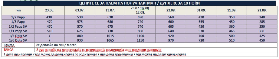 Такса за престој, во висина од 2 еврa по сместувачка единица на ден се плаќа во агенција со резервација и не подлежи на попусти!