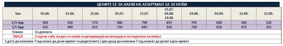 Такса за престој, во висина од 2 еврa по сместувачка единица на ден се плаќа во агенција со резервација и не подлежи на попусти!