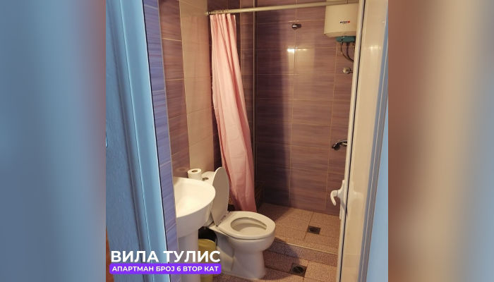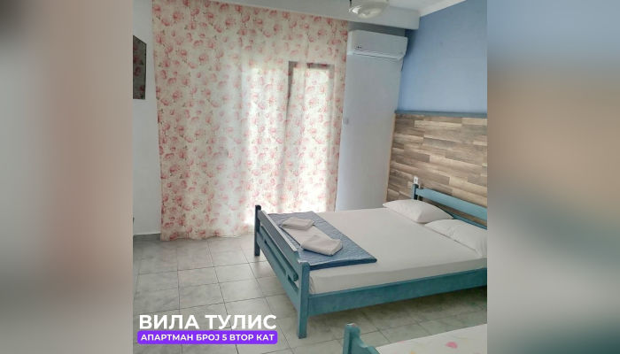 Апп бр.5 (ЗА 4 ЛИЦА) – се наоѓа на втор кат. Десно е соба со брачен и еден единечен кревет, со тв и клима. Апартманот има комплетно опремена кујната со софа, плотна и голем фрижидер. Лево е тоалетот. Тераса со поглед на двор. Препорака е за максимум двајца возрасни и две деца или тројца возрасни и дете.
