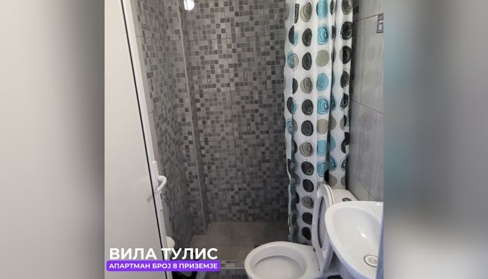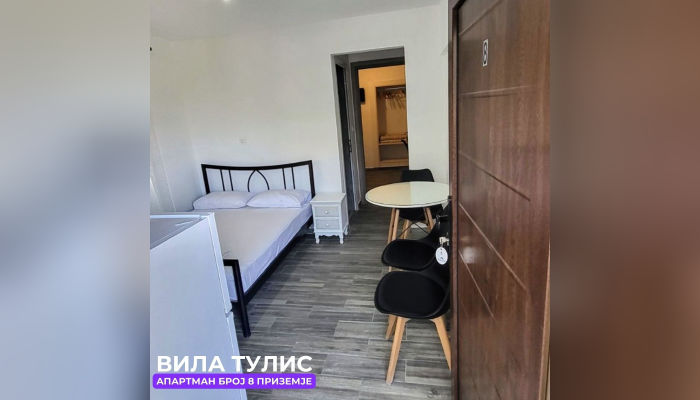 Апп бр. 8 (ЗА 4 ЛИЦА) – се наоѓа на приземје. Апартманот има комплетно опремена кујна со голем фрижидер, решо, маса за ручавање и брачен кревет. Лево е тоалетот. Спалната е со брачен кревет, вграден плакар, тоалетна маса. Оваа соба гледа кон двор.