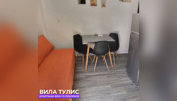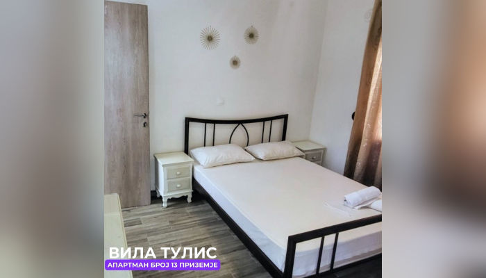 Апп бр.13 (ЗА 3 ЛИЦА) – се наоѓа на приземје. Апартманот има комплетно опремена кујна со голем фрижидер, решо, маса за ручавање и софа за спиење во кујна (препорачуваме на софата да спие дете). Тоалетот е десно, а право се наоѓа спалната соба со брачен кревет, тоалетна маса, тв и клима. Оваа соба има поглед кон паркинг и има посебен влез позади.