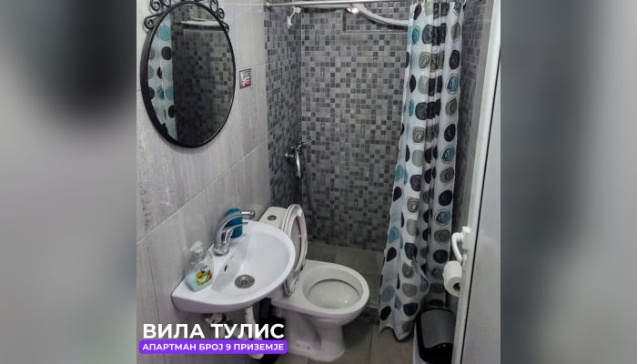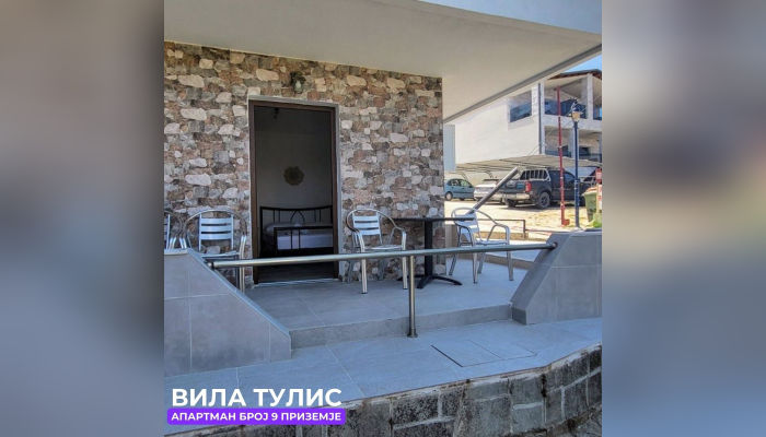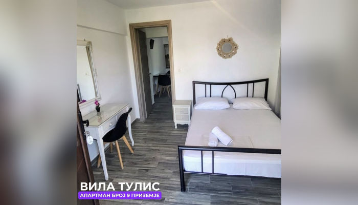 Апп бр.9 (ЗА 4 ЛИЦА) – се наоѓа на приземје, веднаш до апартман бр. 8. Апартманот има соба со брачен кревет, плакар и фрижидер (голем). Десно е тоалетот со стандардна големина. Во кујната, која е комплетно опремена има брачен кревет, масичка за ручавање, плотна со две плочи, електрично ѓезве за кафе, тв и клима. Спалната и кујната се одделени со врата. Апартманот е ист како апартман број 8.