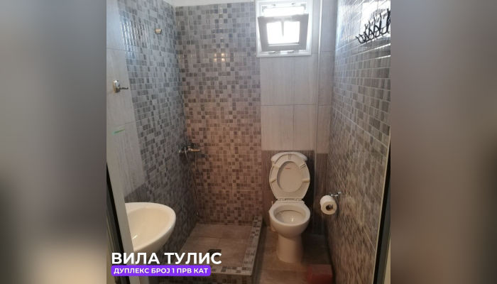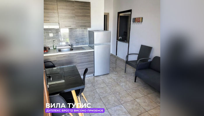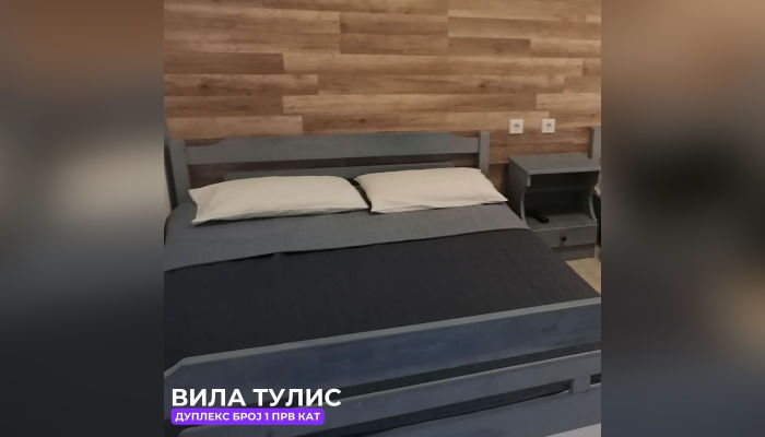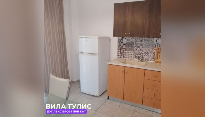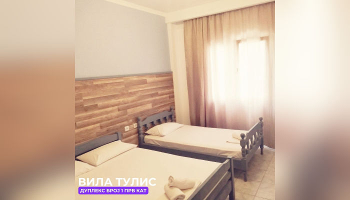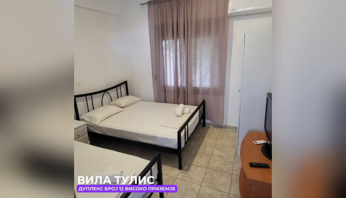 Дуплекс апп бр.1 (ЗА 5 ЛИЦА) – се наоѓа на високо приземје(меѓу кат). Веднаш лево е едната спална соба со брачен кревет, голем плакар, тоалетна маса и климата. Другата спална соба има брачен кревет и еден единечен кревет, со балкон кој е заеднички со кујната, телевизор. Право е тоалетот, а од десна страна пространа кујна опремена со сите елементи, голем фрижидер и масичка за ручавање со тераса со мал поглед на море.