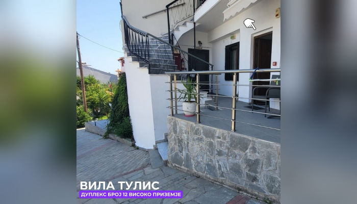 Тулис (целосно реновирана) се наоѓа на 300 метри од плажа во самиот центар на Полихроно, веднаш над црквата. Располага со апартмани за три, четири и дуплекс апартмани за пет лица, комплетно опремени со кујна, тоалет и тераса. За секој апартман има обезбедено приватен бесплатен паркинг, заеднички двор за дружење на гостите, игралиште за кошарка и приватна теретана. Во секој апартман на пасполагање се големи пешкири за туширање. Одличен избор за семејства. 2024-та година имавме само пофалби за комодитет, хигена, локација и гостопримство. Сите апартмани се опремени со клима уред чие користење се доплаќа 35 евра за 7 ноќевања на лице место кај газдите на куќата.