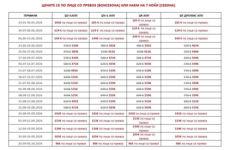 • Клима уред се доплаќа на лице место во објектот