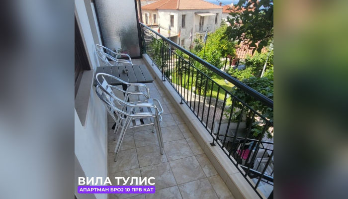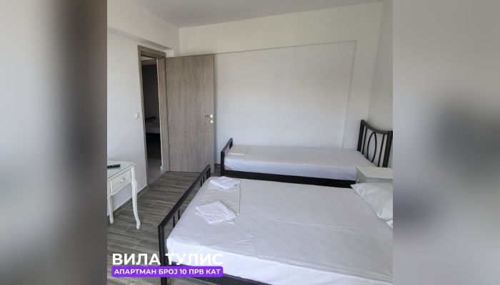 Дуплекс апп бр.10 (ЗА 5 ЛИЦА) – се наоѓа на прв кат. Апартманот има комплетно опремена кујна со голем фрижидер, плотна и маса за ручавање. Лево се наоѓа тоалетот, а десно има соба со брачен кревет и еден единечен кревет, плакар и тв. Другата соба има брачен кревет и клима. Собата гледа према двор.