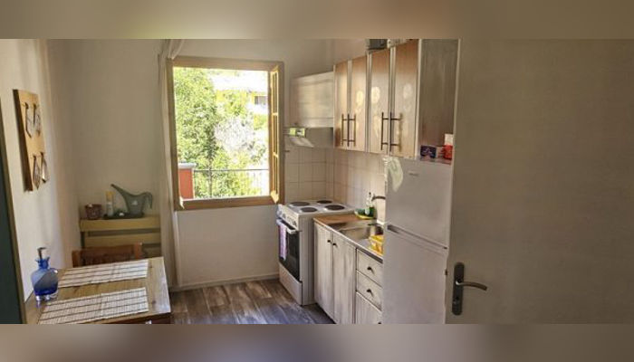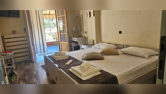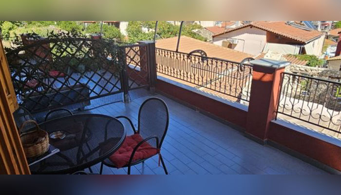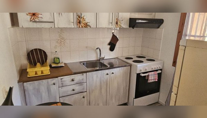 Апартманот се наоѓа на прв кат. Има еден дупли кревет (или може да бидат два единечни) комотен за спиење на 2 лица и може да се додаде еден дополнителен кревет на спуштање за дете до 12 год. Има плакар за алишта,ТВ и клима уред. Кујната е во посебна просторија одвоена со ѕид, опремена со аспиратор, ел.шпорет, голем фрижидер со комора и комлетен кујнски инвентар. Има сопствено купатило. Апартманот излегува на тераса со маса и столици и прекрасен страничен поглед на море.