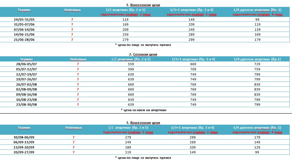 • ЦЕНИТЕ ВО ТАБЕЛА БР.2 – СЕЗОНСКИ СЕ ДАДЕНИ ЗА НАЕМ НА АПАРТМАН/ДУПЛЕКС АПАРТМАН ЗА 7 НОЌЕВАЊА, според бројот на кревети во секоја соба, без вклучен превоз, а истиот се доплаќа: