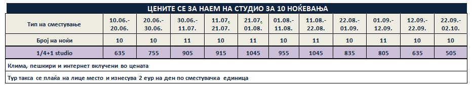 Такса за престој, во висина од 2 еврa по сместувачка единица на ден се плаќа на лице место, на претставникот или сопствениците на објектот и не подлежи на попусти!
