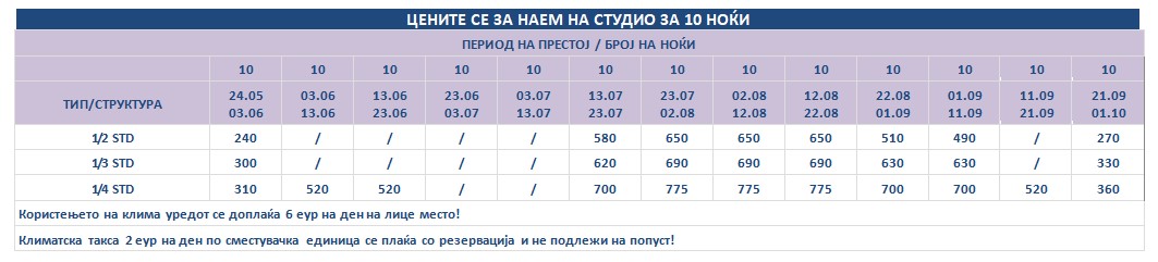 Такса за престој, во висина од 2 еврa по сместувачка единица на ден се плаќа во агенција со резервација и не подлежи на попусти!