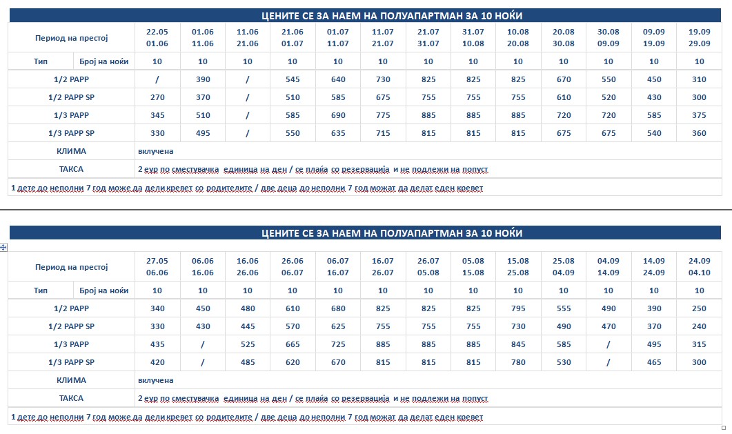 Такса за престој, во висина од 2 еврa по сместувачка единица на ден се плаќа во агенција со резервација и не подлежи на попусти!