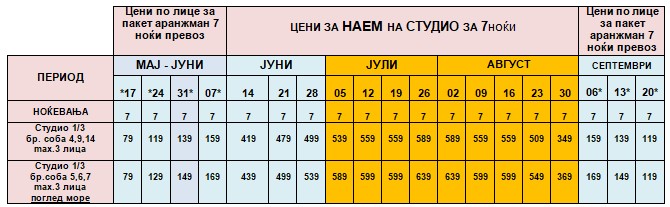 ОЗНАЧЕНИ СО ЗВЕЗДИЧКА * ВО ТАБЕЛАТА СЕ ПАКЕТ АРАНЖМАНИ И СЕ ДАДЕНИ ПО ЛИЦЕ ЗА 7 НОЌИ СО ВКЛУЧЕН АВТОБУСКИ ПРЕВОЗ