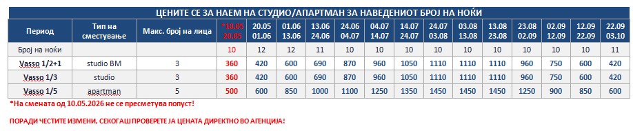 VASSO – Се наоѓа на 140 m од морето, на угорнина покрај црквата. Освен градската плажа, во близина е и една мала увала со карпи и песок. Vasso new е на 2.кат од куќата Vasso и има реновирани студија и апартмани. Двокреветното студио има поглед на целото место и во далечина кон морето, а трокреветно студио и апартманот гледаат кон дворот и градината. Помошниот кревет во 2+1 студио е фиока со душек. Во петкреветниот апартман спалната соба е потесна со потесен француски кревет. Опремени се со фрижидер, решо, по еден голем пешкир, комарници. Сите имаат SAT TV, бежичен интернет, за чија брзина агенцијата не може да гарантира и клима уред, чие користење се доплаќа на лице место.