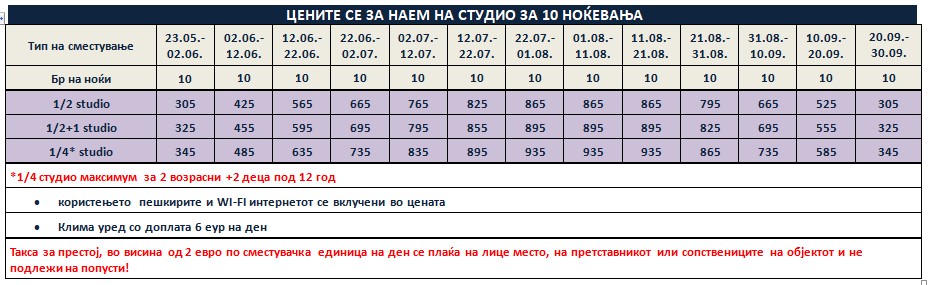 Такса за престој, во висина од 2 еврa по сместувачка единица на ден се плаќа на лице место, на претставникот или сопствениците на објектот и не подлежи на попусти!