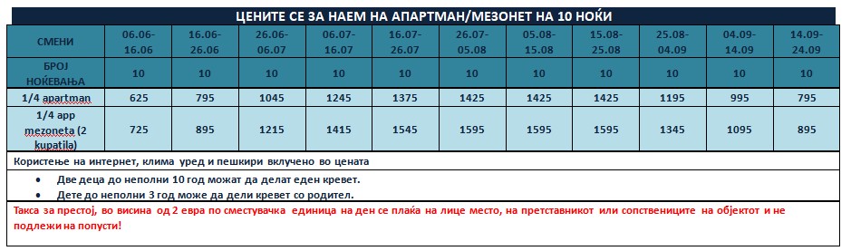 Такса за престој, во висина од 2 еврa по сместувачка единица на ден се плаќа на лице место, на претставникот или сопствениците на објектот и не подлежи на попусти!