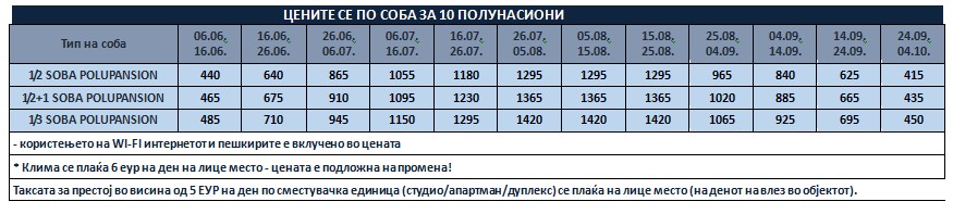 Такса за престој, во висина од 2 еврa по сместувачка единица на ден се плаќа на лице место, на претставникот или сопствениците на објектот и не подлежи на попусти!