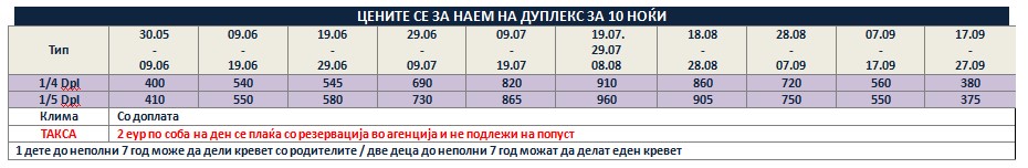 Такса за престој, во висина од 2 еврa по сместувачка единица на ден се плаќа во агенција со резервација и не подлежи на попусти!