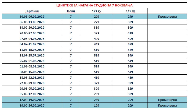 • Цените се за наем на студио за 7 ноќевања (без превоз).