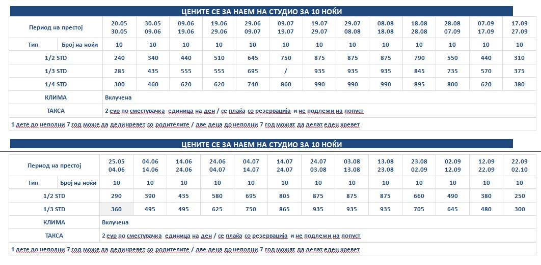 Такса за престој, во висина од 2 евра по сместувачка единица на ден се плаќа во агенција со резервација и не подлежи на попусти!