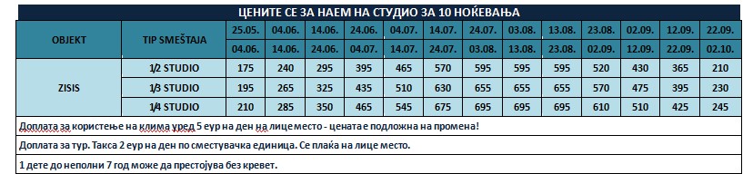 Такса за престој, во висина од 2 евро по сместувачка единица на ден се плаќа на лице место, на претставникот или сопствениците на објектот и не подлежи на попусти!